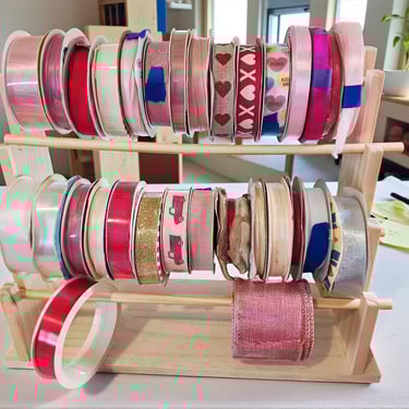 The Ribbon Tower: My ribbon collection was getting a bit out of hand, so this tiered wooden rack is a total game-changer. It’s so satisfying to see all those pinks, reds, and textures lined up and ready for my next project.